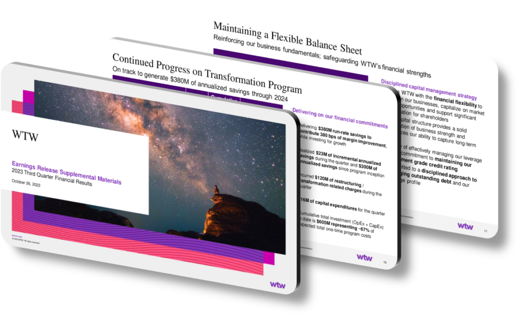 WTW’s Q3 2023 financial results presentation was a testament to its strategic execution and innovative approach to communication. By combining a well-structured design, impactful visuals, and clear messaging, the company effectively conveyed its robust performance and strategic progress. As WTW continues to invest in growth areas and enhance operational efficiency, it remains well-positioned for future success, ensuring long-term financial stability and reinforcing its leadership in the industry.
