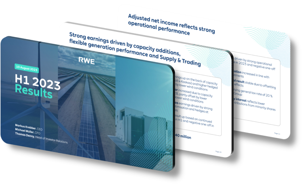 Overall, RWE AG’s H1 2023 results presentation successfully communicated a period of robust performance and strategic growth. Through its thoughtful design, clear structure, impactful visuals, and positive messaging, the presentation not only detailed RWE’s achievements but also set a confident tone for the future. As the company continues to prioritize green energy and operational excellence, stakeholders can look forward to a promising trajectory of sustained growth and environmental leadership. RWE’s achievements in H1 2023 position it as a formidable player in the renewable energy sector, with a significantly improved outlook for the full year.