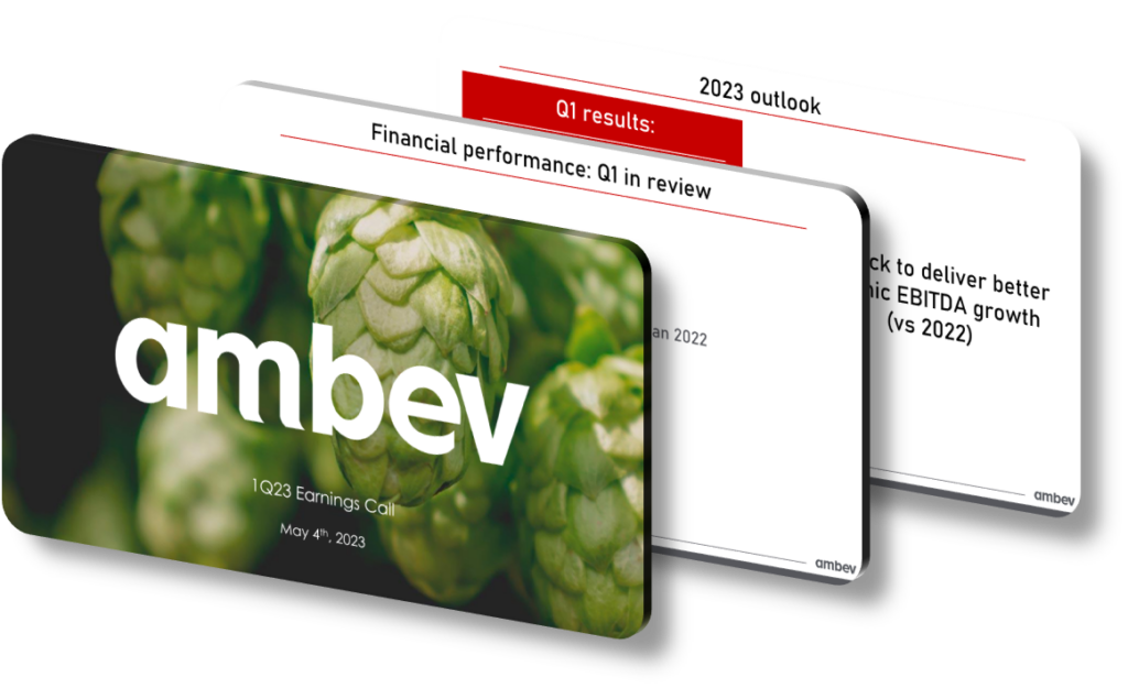 In summary, Ambev S.A.’s Q1 2023 presentation was a masterclass in delivering a clear, impactful message. Through strategic design, engaging visuals, and focused messaging, the company effectively communicated its strong financial performance and strategic priorities. Ambevโs unwavering commitment to sustainable growth and profitability promises a promising trajectory moving forward.