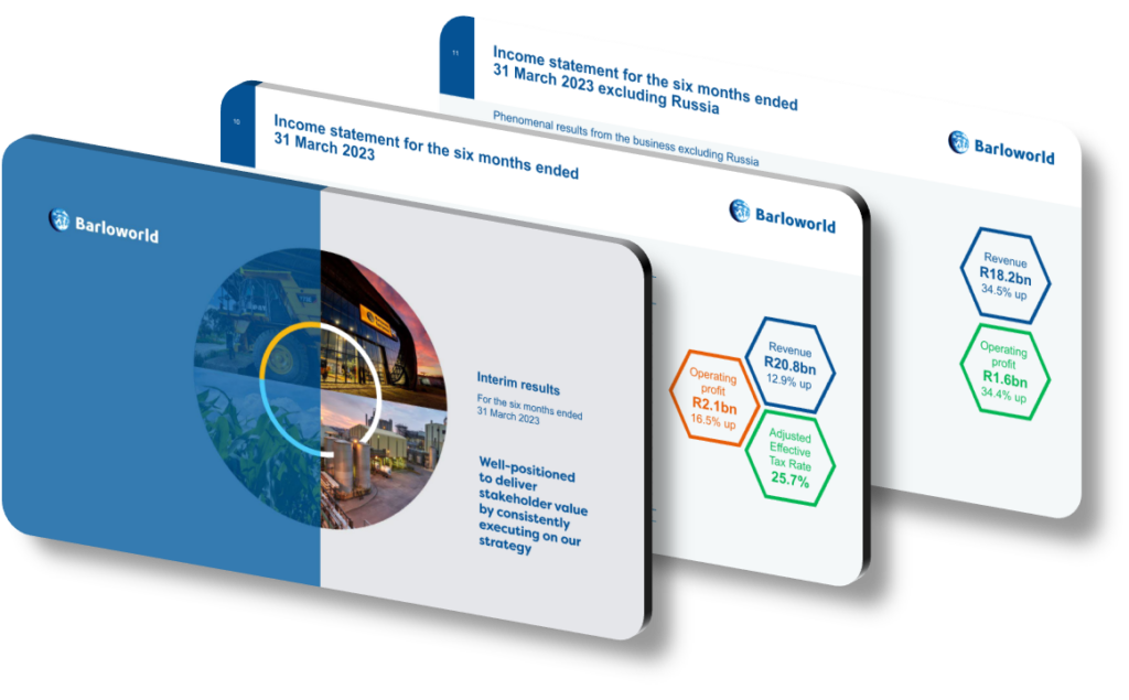 In conclusion, the interim results presentation for Barloworld was not only a reflection of its strategic progress and financial performance but also an exemplar of effective communication. By leveraging a well-crafted design, structured format, and impactful visuals, the presentation delivered a clear and positive message, reinforcing Barloworld’s position as a robust and forward-thinking organization committed to sustainable growth and excellence.
