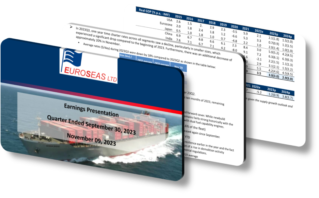 In conclusion, Euroseas Ltd.’s Q3 2023 earnings presentation was a masterclass in effective communication, combining strategic insights with compelling visuals and messaging. The company’s strong financial performance, strategic initiatives, and commitment to sustainability were clearly articulated, reinforcing Euroseas’ position as a leader in the maritime industry. With a focus on shareholder value and market adaptability, Euroseas is poised for continued success in the quarters to come.