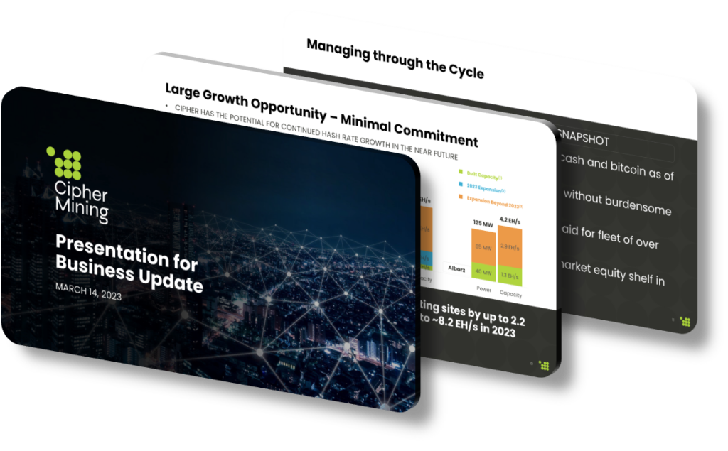 In summary, Cipher Mining’s March 2023 business update expertly utilized presentation design, structure, visuals, and messaging to deliver a powerful and positive narrative. The company’s strategic advancements and operational milestones were communicated with clarity and impact, reinforcing its position as a leader in the evolving bitcoin mining industry.