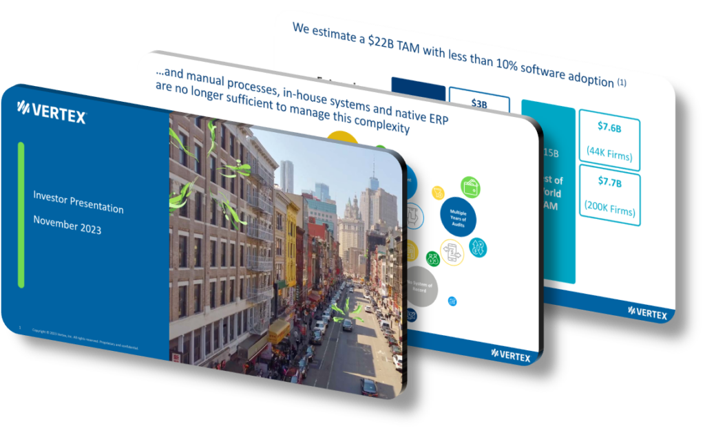 - Data-Driven Graphics: Charts and graphs are used to illustrate growth in cloud and subscription revenues, showcasing Vertex’s scalable tax technology platform.