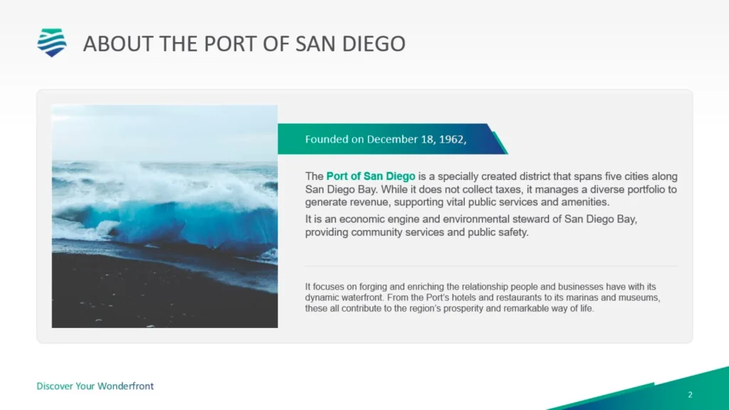 Our goal when we built Port of San Diego’s presentation was to highlight its multifaceted role as an economic catalyst and scenic destination. Through compelling visuals and succinct content, we put a spotlight on Port of San Diego’s diverse industries.